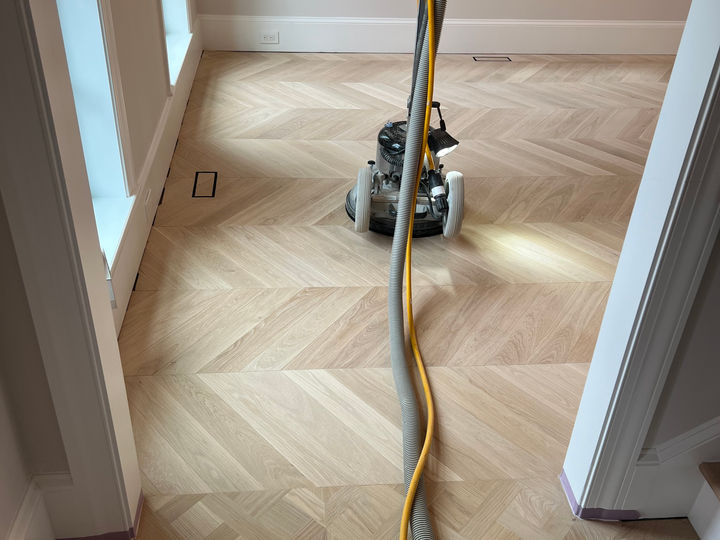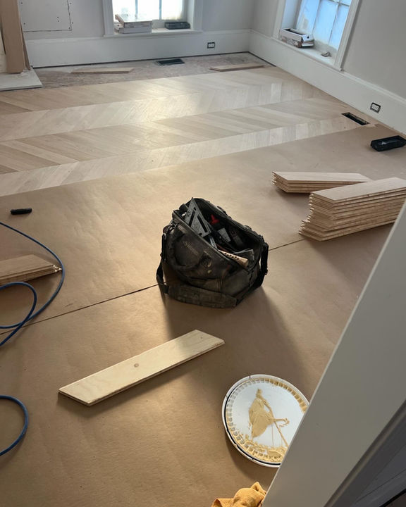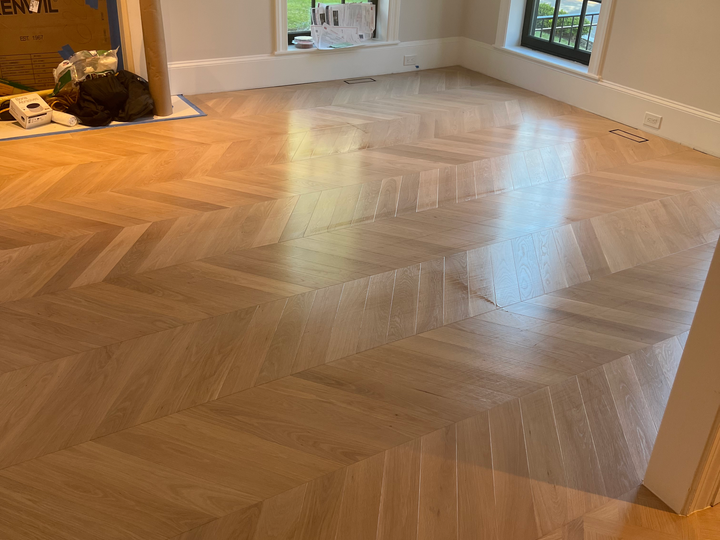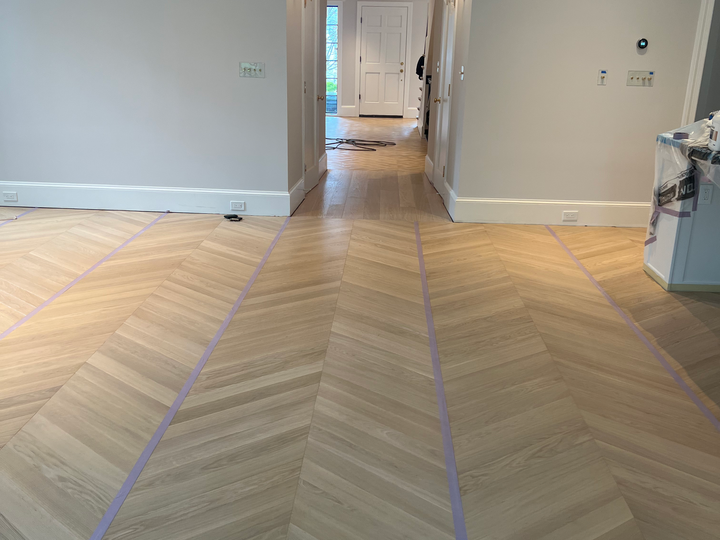 In this residence the customer decided to pick custom chevron floors for their house. Chevron Floors are unique because of the attention to detailed that is required. Every angle cut needs to be percise to fit the design. The cuts then form a "V" shape on the floors with a zig zag pattern.